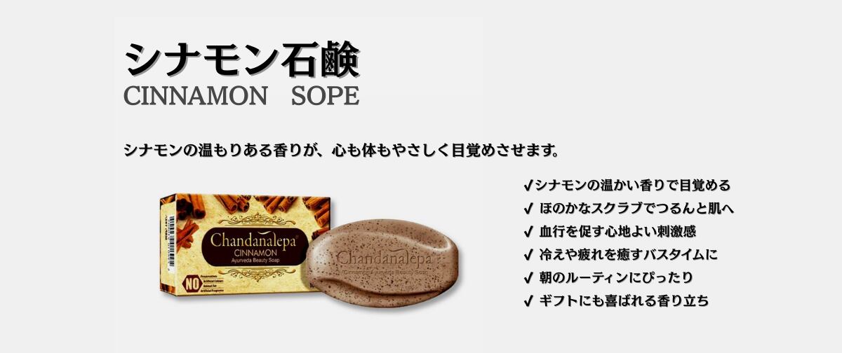 スリランカ伝統のシナモンに基づき、天然ハーブとオイルをブレンドした石鹸です。 お肌の汚れをやさしく落としながら、しっとりとした潤いを与えます。合成香料・着色料は一切不使用。 毎日のバスタイムで、ハーブの香りに包まれる癒しをお楽しみください。